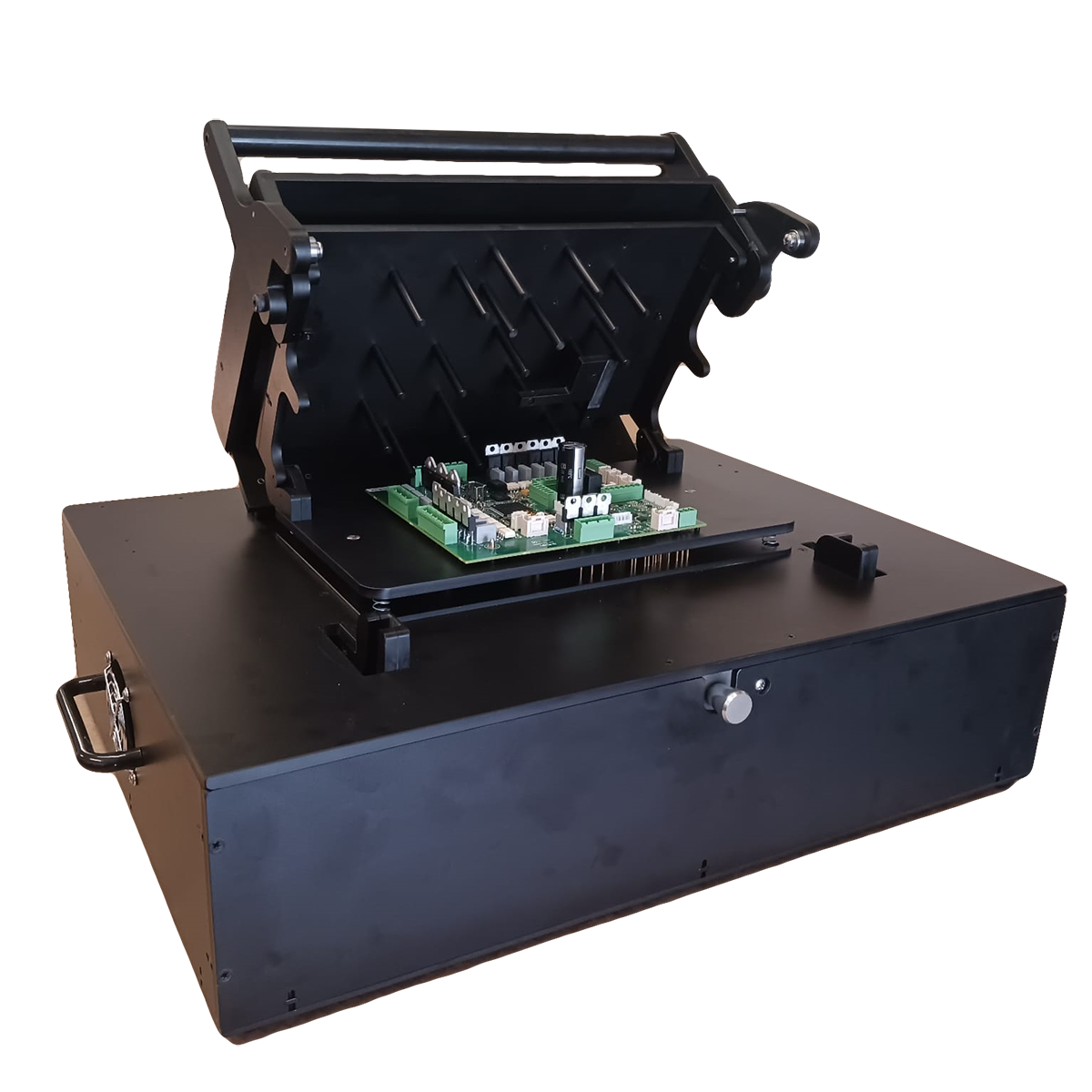 These fixtures simplify the whole programming and testing process. Instead of an operator manually attaching cables or running separate tests one at a time, the board is placed inside the fixture, the lid is closed, and the machine does the rest automatically.